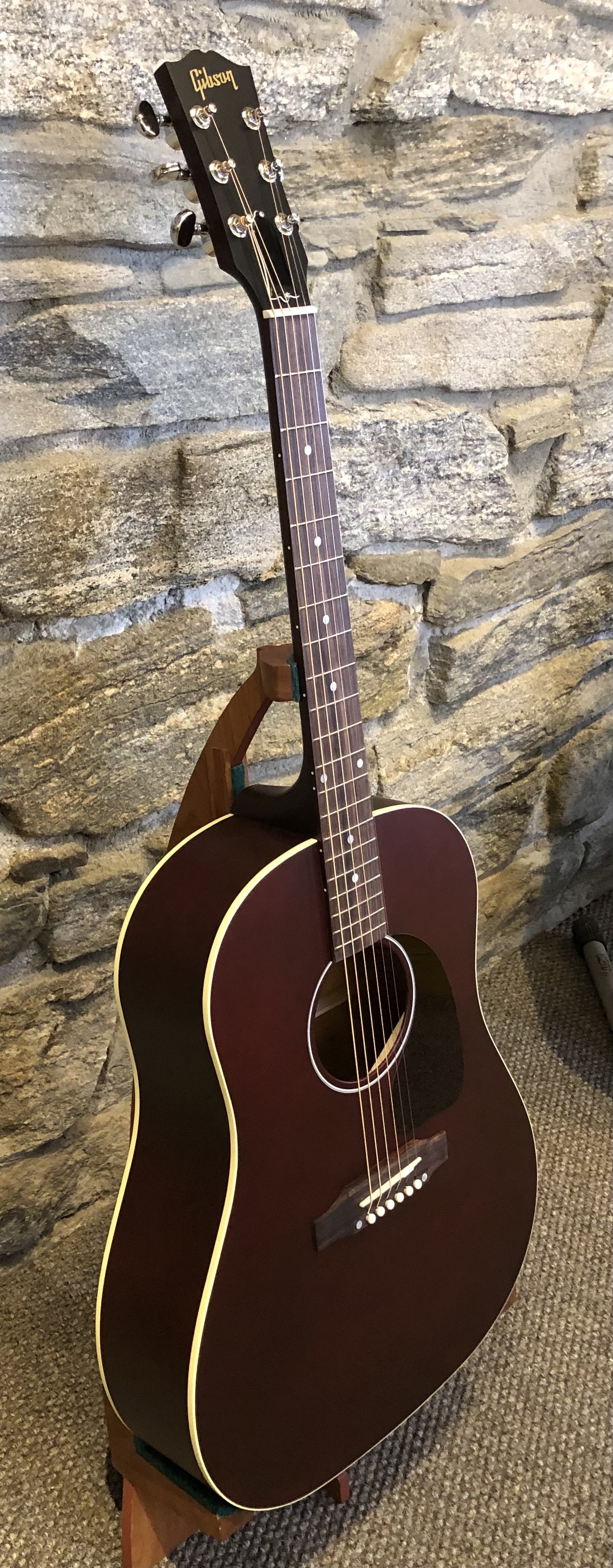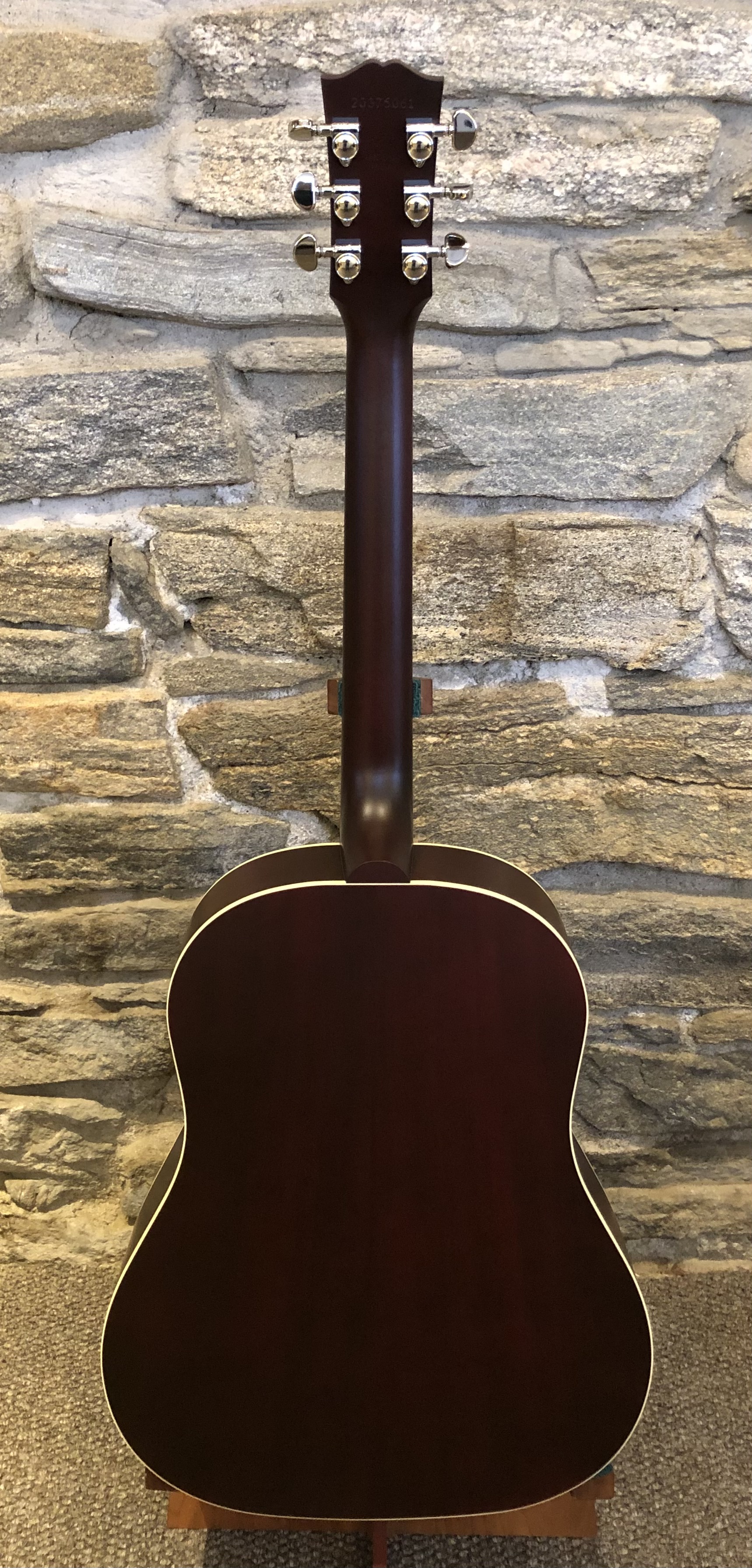 Solid mahogany round shoulder body, solid Sitka spruce top, SlimTaper profile utile neck, rosewood fretboard with 20 standard frets and mother-of-pearl dot inlays, satin nitrocellulose lacquer finish, L.R. Baggs electronics, premium soft shell case